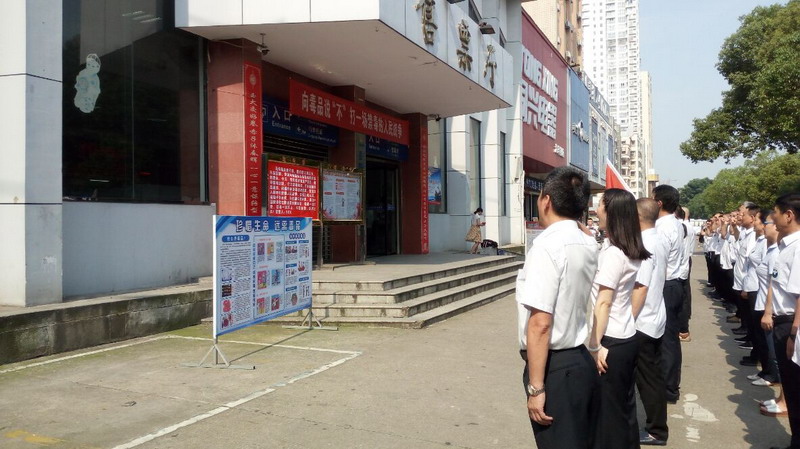 6月11日,岳阳汽车站广场人头揽动,站门前悬挂着“向毒品说‘不’,打一场禁毒的人民战争”的横幅,广场内摆放有“珍爱生命、远离毒品”的宣传展板。上午9时,来自集团公司机关、客运分公司、站务分公司、联运物流公司、商贸分公司、旅游分公司及市交通运输行政执法支队共200多人会聚车站广场,排着整齐队伍,举起右手,进行了庄严的禁毒宣誓:遵守禁毒法规,学习禁毒知识,坚决抵制毒品诱惑……。宏亮、高亢的宣誓声音久久回荡在汽车站广场上空。