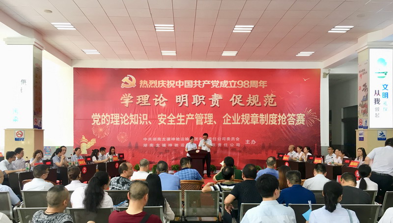 6月28日,岳阳汽车站候车室人员聚集,气氛紧张而热烈,集团公司在这里举行2019年“党的理论知识、安全生产管理、企业规章制度”抢答赛,来自各二级单位的12支队伍参加了比赛。集团公司党委书记胡太勋为比赛致辞,集团全体领导全程观看比赛并为获胜队伍颁奖。