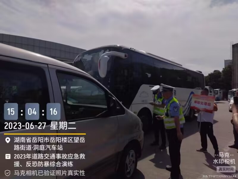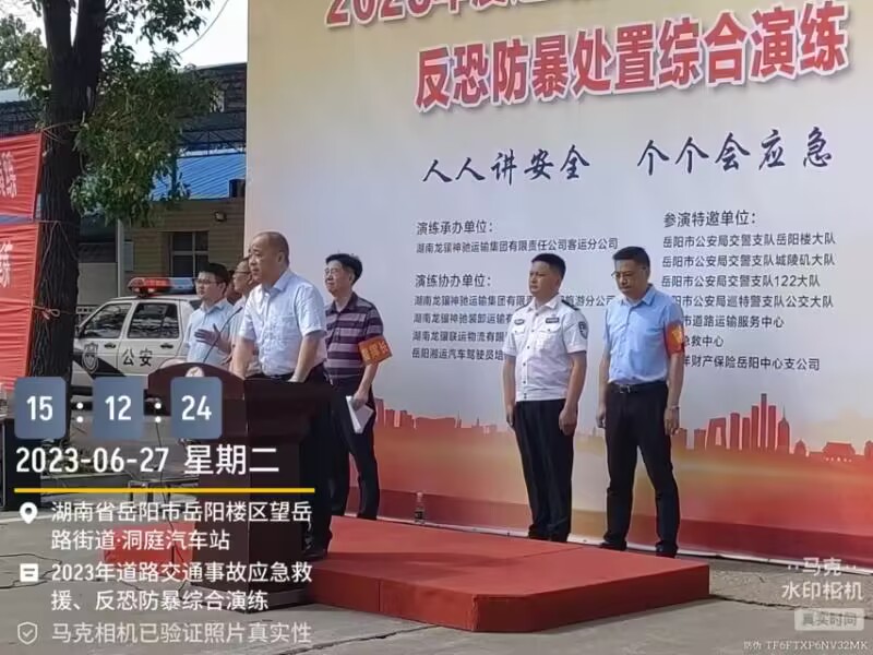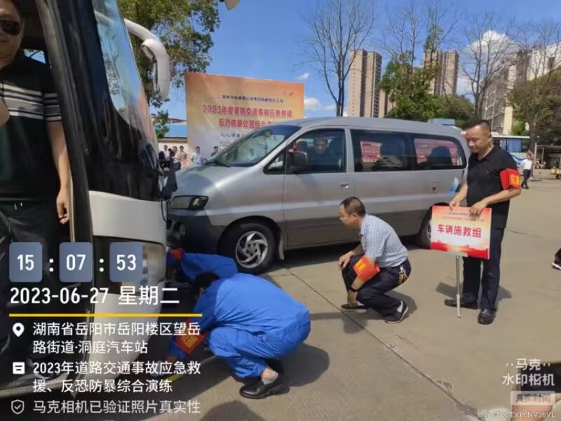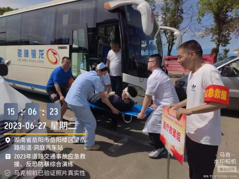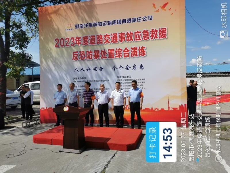 2023年6月27日下午3时,湖南龙骧神驰运输集团有限责任公司2023年道路交通事故应急救援、反恐防暴处置综合应急演练在客运分公司洞庭汽车站车坪内成功举行。
