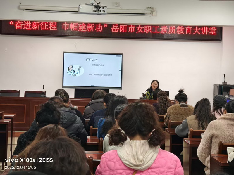 2025年12月4日下午,“奋进新征程 巾帼建新功”女职工素质教育大讲堂活动在集团公司四楼大会议室开讲。岳阳市芙蓉公益讲师、岳阳职业技术学院中国语言文学教授段淑萍女士为来自基层单位的近40名女职工讲授了一堂“好好说话”的素质教育公益课。
