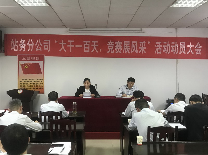 为认真落实集团公司关于开展“大干一百天,竞赛展风采”活动要求,努力完成集团公司《2020年经济工作纲要》中涉及站务分公司的工作任务。2020年4月28日下午,站务分公司在洞庭汽车站二楼会议室组织召开“大干一百天,竞赛展风采”竞赛活动动员会,分公司领导及各科室、车站负责人、部分车站办室负责人共计30余人参加动员会,分公司副经理李颜宣读竞赛活动方案并作活动动员,分公司经理李渡江主持会议。