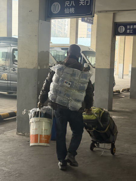 站前广场上,一个个身影在细雨中穿梭,他们背着、提着、拉着各式各样的行李,那沉甸甸的包裹里,装着的不仅仅是一件件物品,更是对家乡亲人满满的爱与牵挂。尽管寒风凛冽,细雨打湿了他们的发丝和衣衫,却丝毫阻挡不了他们归乡的脚步,反而让那份急切与喜悦愈发浓烈。
