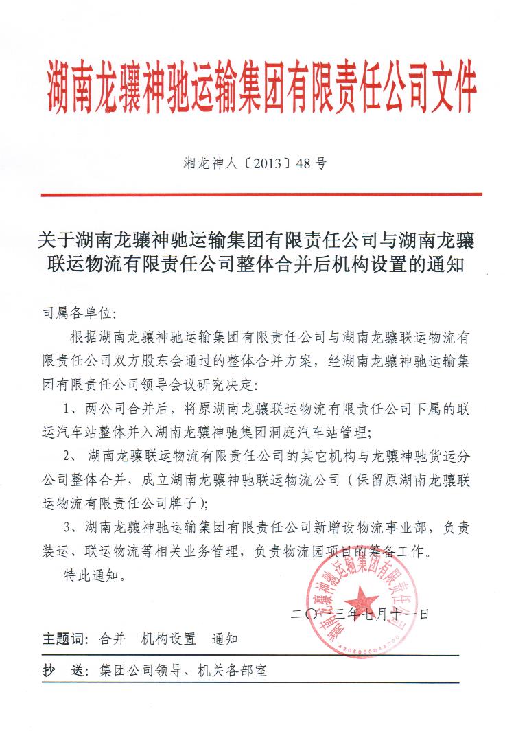 关于湖南龙骧神驰运输集团有限责任公司与湖南龙骧联运物流有限责任公司整体合并后机构设置的通知
