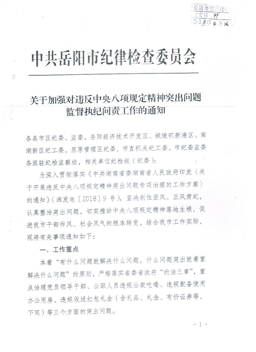 岳阳市纪委《关于加强对违反中央八项规定精神突出问题监督执纪问责工作的通知》