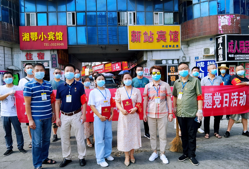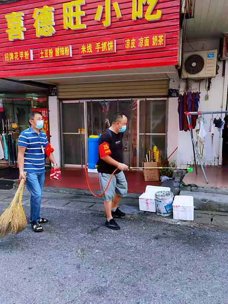 “党员示范岗”集体、全体党员和入党积极分子积极响应支部倡仪,于84日上午900,统一佩戴工作标识牌、袖标、口罩、手套,党员佩戴党徽,顶着烈日炎炎在运通街北门集合。活动首先对在建党百年之际评选出来的两位支部“优秀共产党员”予以表彰。随后分两组逐户上门开展防疫防控宣传发动、派发宣传单、政策讲解;用心、细心、耐心劝导经营户尽快接种疫苗、戴好口罩、做好自我防护、通风消毒和自我健康监测。同时对整个运通街商贸街区进行卫生保洁、死角清理和全面消毒处理。