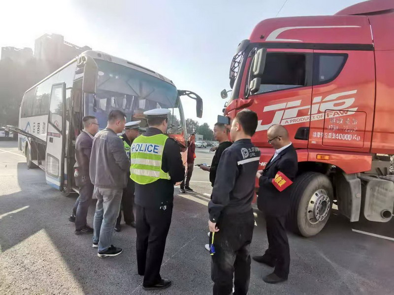 演练模拟大客车在行驶中与大货车相撞造成事故并引发火灾,两车受损严重,大客车有2名乘客受伤,且发生事故后两车驾驶员、随车人员发生纠纷,大货车随车人员抽出刀具行凶,导致客车随车人员受伤。客车驾驶员一方面组织疏散旅客,抢救伤员,一方面拨打120、122、119、95500和公司领导电话,龙骧神驰董事长张怀国指示立即启动救援预案,组织现场灭火、医疗救援、旅客转运、122事故处理、车辆施救等应急队伍火速赶赴现场,配合交警、120急救和消防人员进行现场处置。与此同时,公安特警迅速出警,成功控制暴力分子并捉拿归案;120急救人员将受伤驾驶员和因事故受伤的旅客进行简单救治后送医;事故导致漏油起火,火情被迅速扑灭;滞留旅客全部疏散并安全转运;交警赶赴现场对事故原因进行调查确认;保险公司对事故现场进行初步勘查;事故车辆也在现场抢修后有序进行转移,事故现场应急处置全面完成。