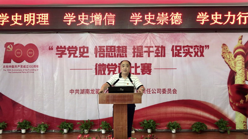 为推动党史学习教育深入开展,以昂扬姿态迎接中国共产党百年华诞,6月1日下午,湖南龙骧神驰集团党委在机关办公楼四楼会议室举行“学党史、悟思想、提干劲、促实效”微党课比赛。集团公司领导、机关部室长、各单位党组织负责人、支部委员、党群科长、党员代表以及参赛选手近100人,参加了比赛活动。