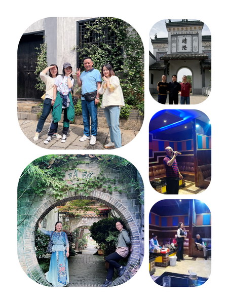 活动当天,岳阳下起了中雨,但靖港古镇雨后晴空,微风拂面,空气清新怡人,特别适合徒步游览。员工们饶有兴趣的沿途参观了毛主席手迹展览馆、文革时期物品陈列馆、族谱陈列馆、民俗文物馆、恐龙化石馆和老寿星树、古镇麻石街、观音殿,杨泗庙、当铺旧址、临河戏台等景点,了解它的红色历史还有非遗文化。大家边走边品尝了古镇老街手工猫耳朵、火焙鱼、现泡擂茶等特色小吃,让人回味无穷,流连忘返。