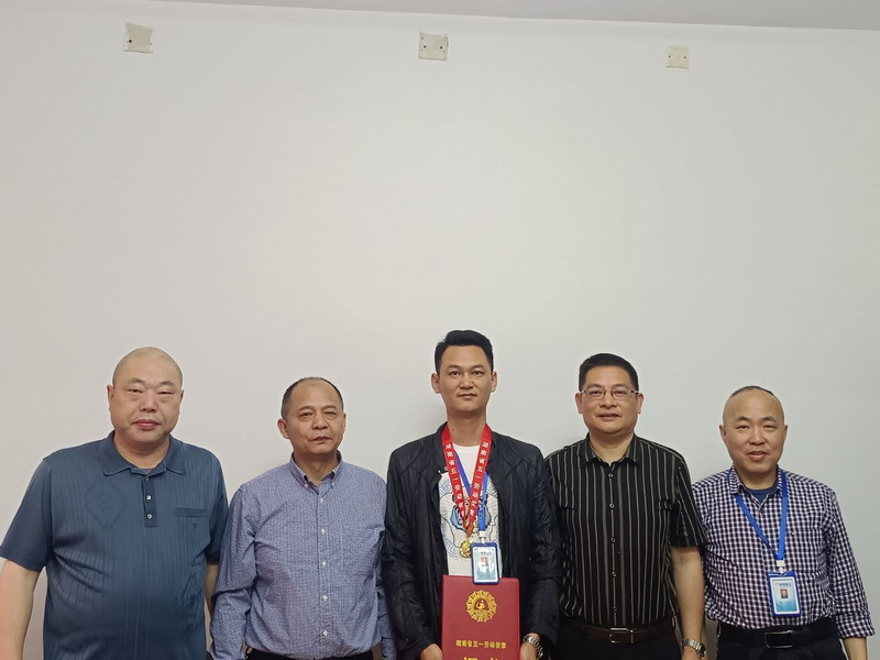 2022年4月22日上午,集团公司纪委书记、监事会兼工会主席许峰、副总经理王斌率党群工作部、安全机务保卫部负责人一行,来到客运分公司,为“湖南省五一劳动奖章”获得者邓险颁发荣誉证书和奖章。