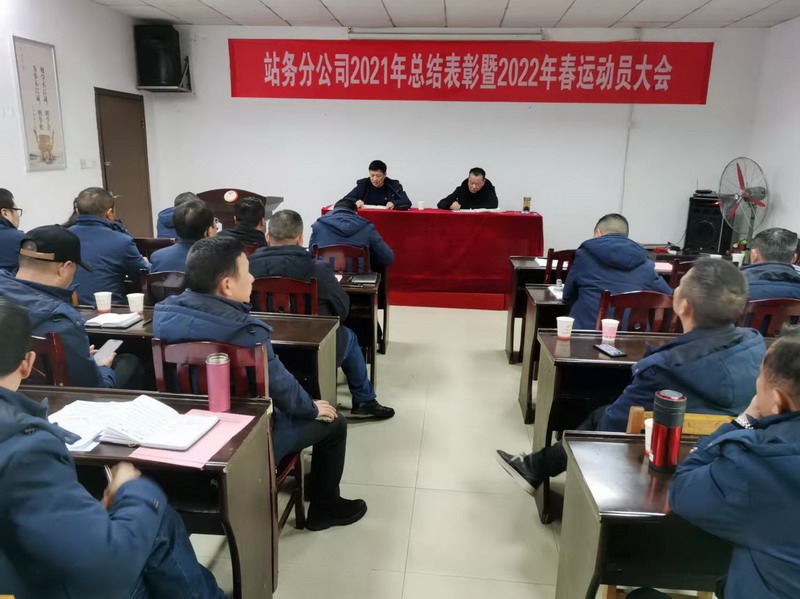 站务分公司2021年总结表彰暨2022年春运动员大会于1月11日下午在洞庭汽车站二楼会议室召开。分公司领导及各车站班子成员、机关各科室长共计35人到会,会议由总支书记李辉主持。
