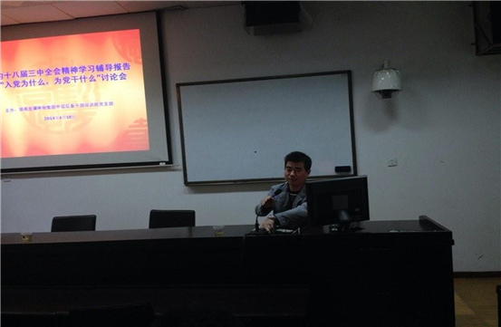4月18日下午,集团公司中层后备干部培训班临时党支部在湖南理工学院东院1号教学楼电教室,组织举行了一次党员主题学习活动。集司党务工作部部长曾令军、副部长姚传军莅临指导,湖南理工学院南湖学院经管系党总支书记李革新讲师出席并授课,培训班20余名党员积极参加。