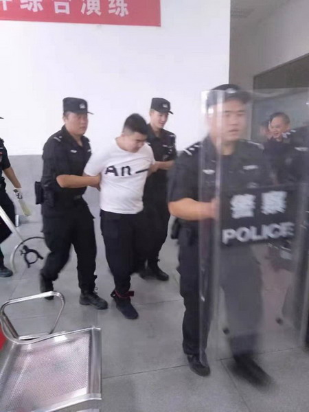上午10时30分许,随着演练总指挥、巡特警支队余政委一声令下,演练正式开始。一名身着白色短袖的“歹徒”进入车站售票厅,抽出藏在衣内的两把砍刀朝正在排队购票的旅客砍去,众旅客蜂拥着四处躲避。接着,“歹徒”又朝候车室冲去,在“三品”安检处和车站安保人员相遇,安保人员一边喊话,一边手持盾牌与“歹徒”对峙。这时,广播里响起了播音员急促的声音:车站有“歹徒”行凶,请旅客随车站工作人员紧急疏散。同时拨打了报警电话。几分钟后,防暴特警赶到,将冲进候车室的“歹徒”团团围住,步步逼到墙角,用防暴器械将其制服。