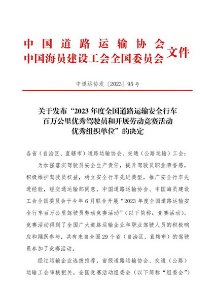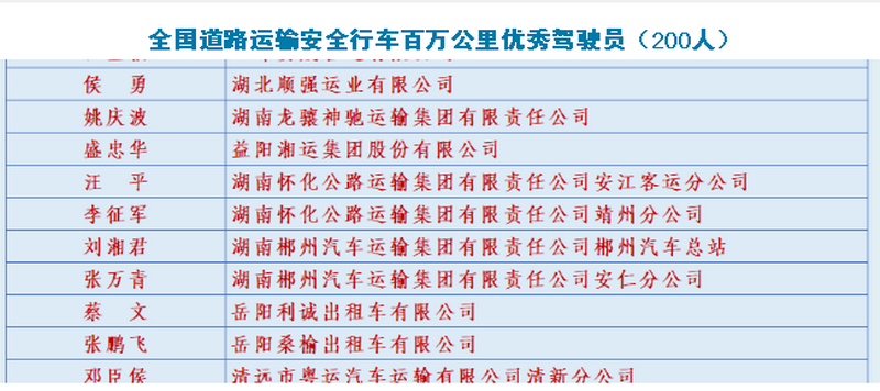 2023年12月6日,中国道路运输协会、中国海员建设工会全国委员会印发决定,公布了“2023年度全国道路运输安全行车百万公里驾驶员劳动竞赛活动”获得相关荣誉称号的人员名单。客运公司1车队驾驶员姚庆波荣获“2023年度全国道路运输安全行车百万公里优秀驾驶员”荣誉称号。本次竞赛活动,湖南省共有8名驾驶员获得荣誉称号。