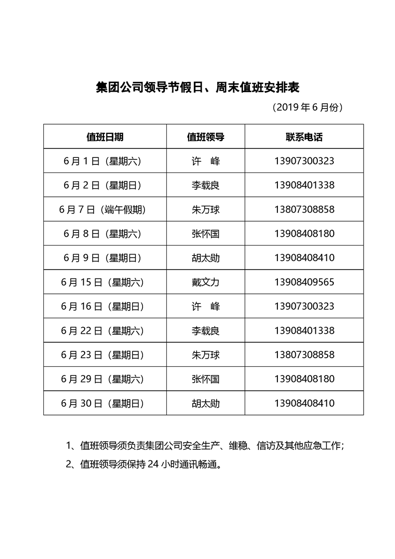 2019年6月集团公司领导节假日、周末值班安排表